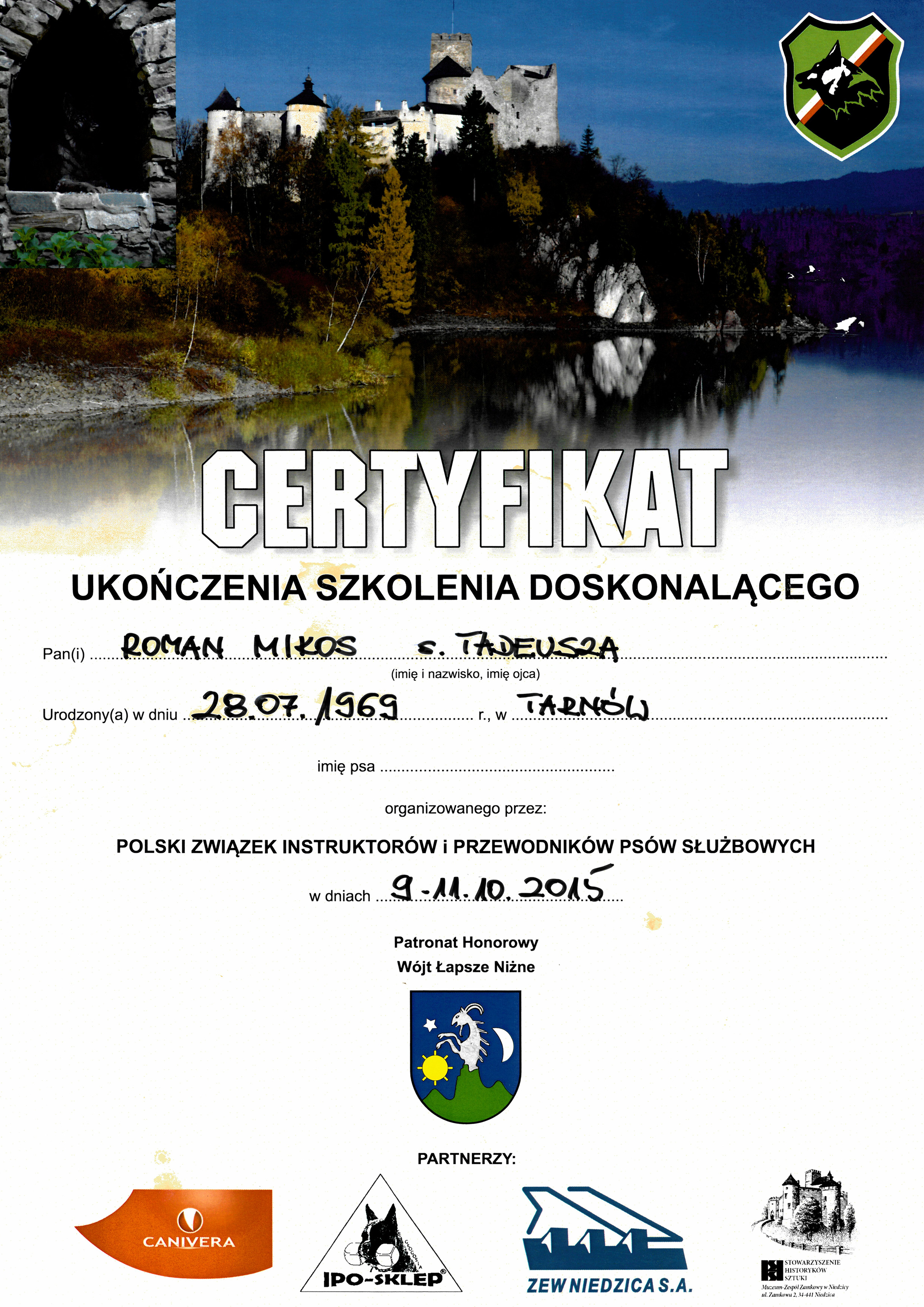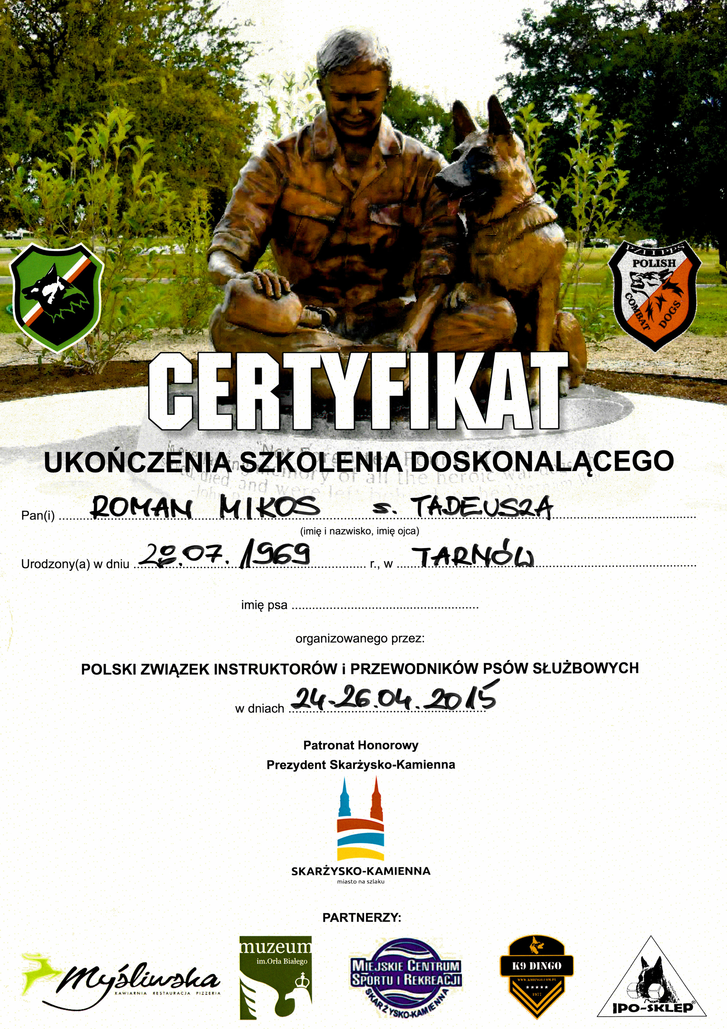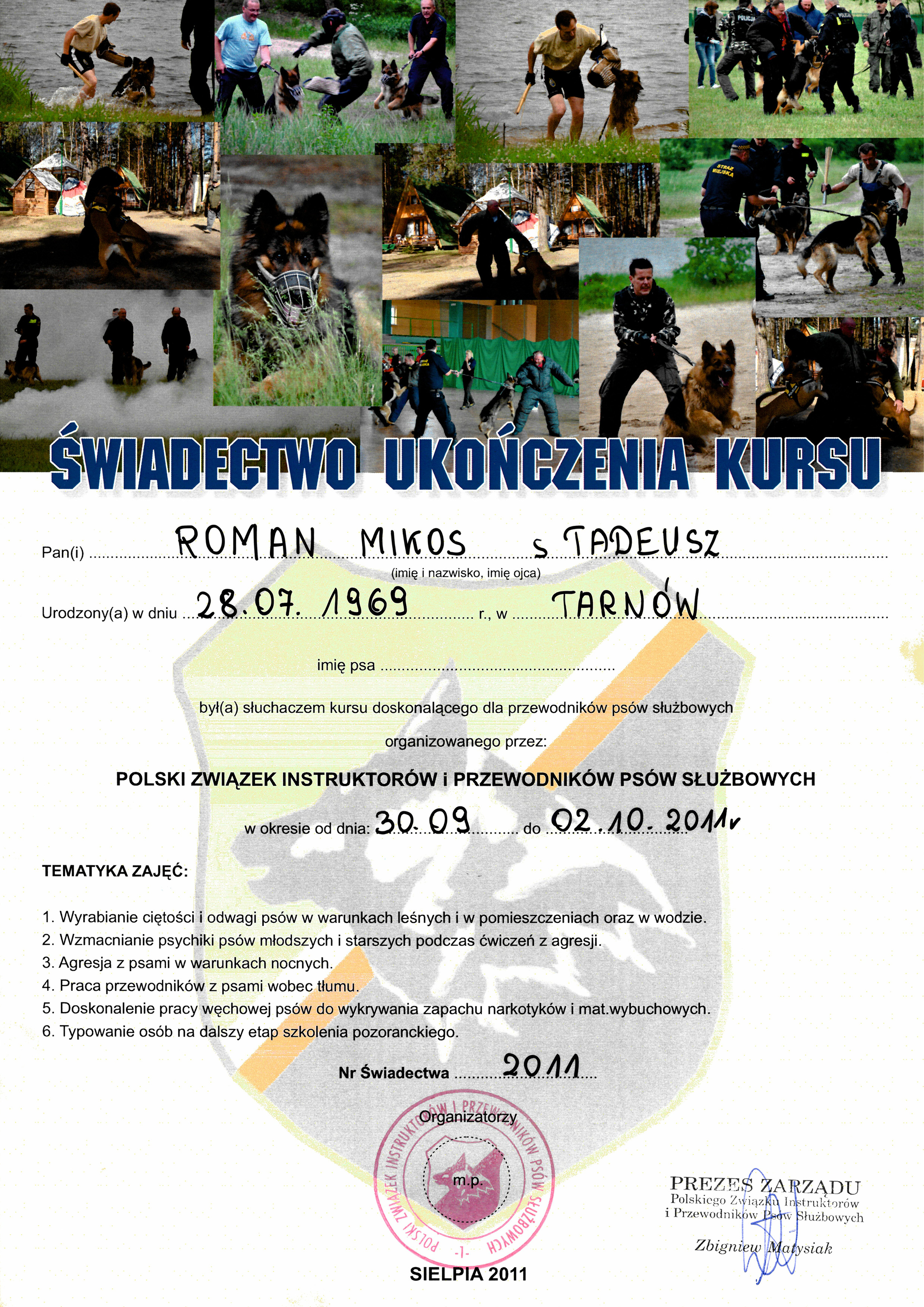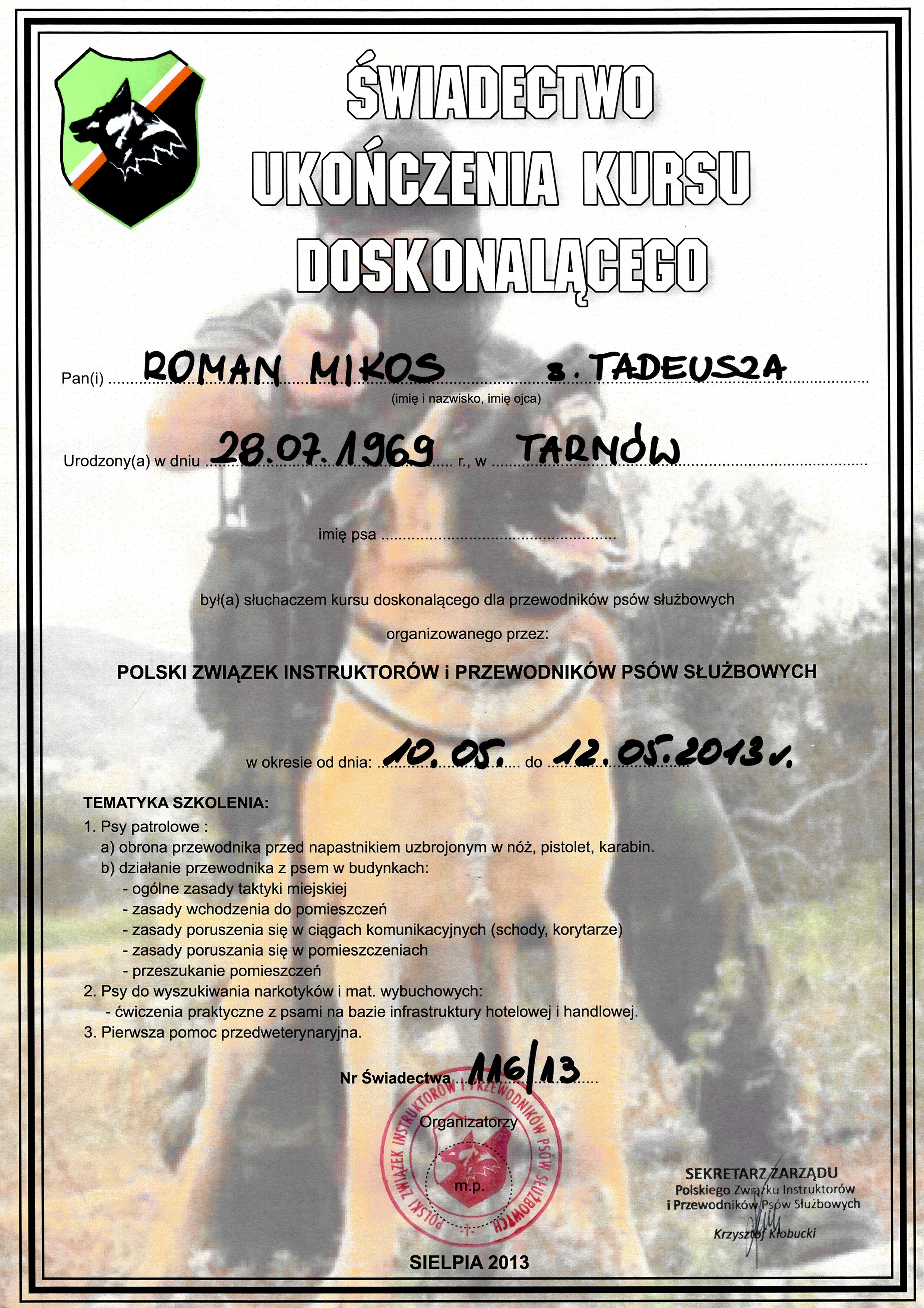 Swoją przygodę ze szkoleniem psów rozpocząłem w 1991r w Zakładzie Szkolenia Przewodników i Tresury Psów w Sułkowicach gdzie ukończyłem kurs przewodników psów tropiących. Pracując w Policji przez 21 lat byłem przewodnikiem dziewięciu psów tropiących, patrolowo-tropiących i specjalnych. Doskonaliłem swoją wiedzę na różnych kursach oraz opracowałem własne metody szkoleniowe. Dwukrotnie uczestniczyłem z psami w Kynologicznych Mistrzostwach Polski Policji. Aktywnie uczestniczę w szkoleniach organizowanych przez Polski Związek Instruktorów i Przewodników Psów Służbowych jako instruktor-pozorant. Obecnie pracuję w firmie ochrony Orzeł, jako przewodnik psa obronnego oraz prowadzę szkołę tresury psów. Występowałem w programach telewizyjnych: "Weterynarze z sercerm" i "Psia służba". Prowadzę szkolenie psów w miejscowości Olszyny 188, 33-164 Olszyny, gmina Rzepiennik Strzyżewski, powiat Tarnów.